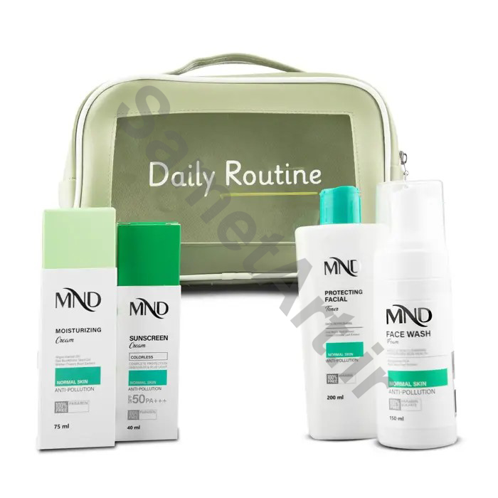 این پک مراقبت روزانه MND مناسب پوستهای معمولی بوده و شامل فوم شستشو، تونر صورت محافظت کننده، کرم مرطوب کننده و کرم ضدآفتاب است.
